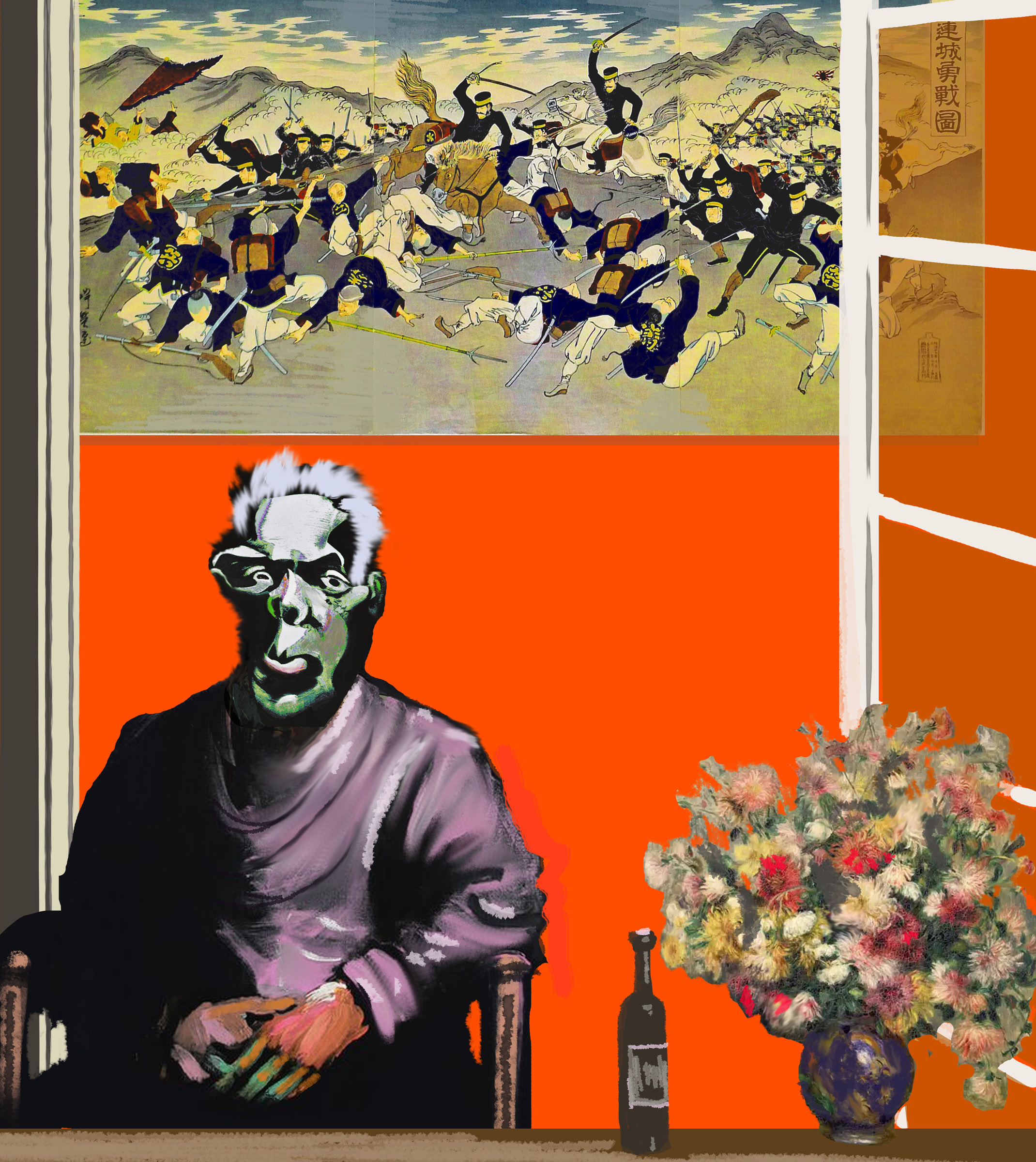 A half-length portrait of an old man, this work weaves together the residue of lived experience and the symbolism of memory. The backdrop, a fragment of battle painting, evokes histories witnessed and endured, while the vivid bouquet in the foreground offers a counterpoint—an emblem of fleeting beauty and the persistence of life amid conflict. The composition becomes a meditation on time, endurance, and the duality of remembrance.