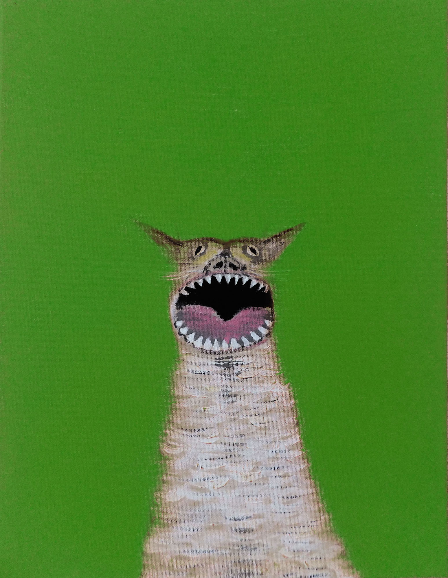 A screaming cat, this time on a green ground, continues the artist’s exploration of animal expression and psychological tension. Like its orange counterpart, this work traces its lineage to a red-background study from 2015, part of a series of swift, experimental portraits. Its selection for Cat Art Show LA and subsequent sale underscore the resonance of these feline images.